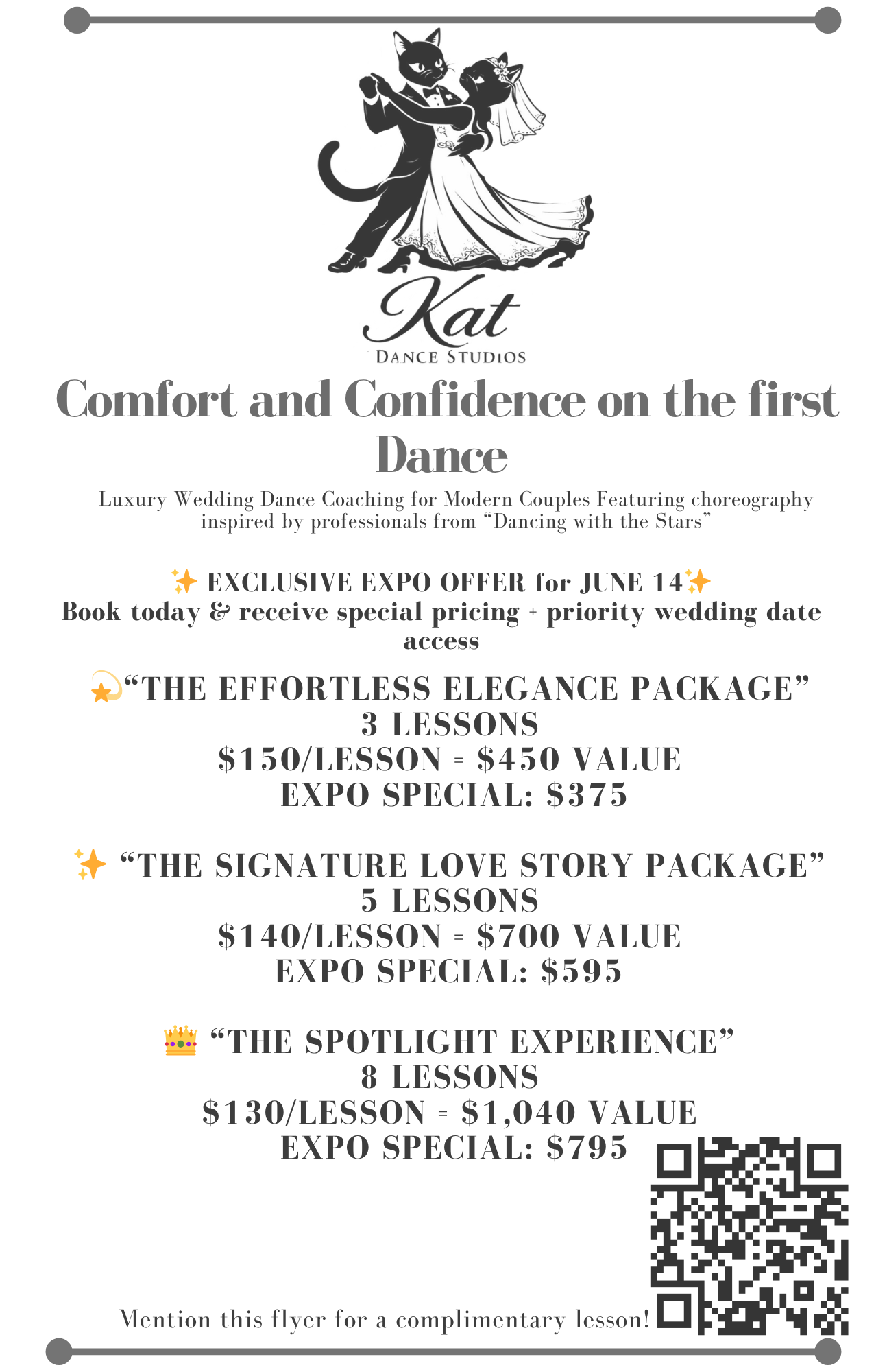 KAT Dance Studio specializes in elegant, confidence‑building wedding dance instruction designed to create unforgettable first‑dance moments. With over 15 years of professional experience in ballroom, social dance, and wedding choreography—and performance credentials at the highest competitive and televised levels—our studio delivers polished, personalized instruction tailored to each couple’s story, skill level, and vision.